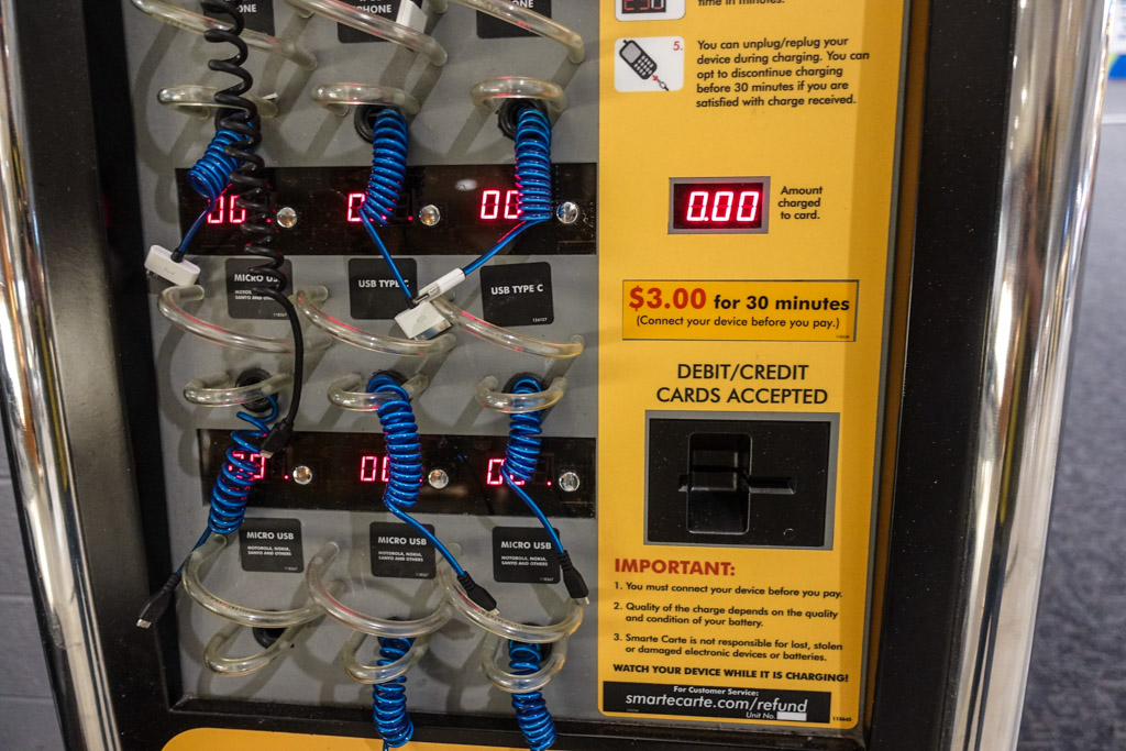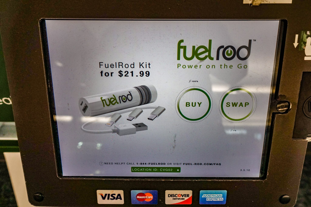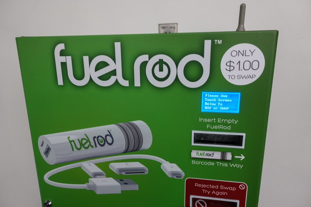 9. Если вам не хочется пастись возле такой заряжалки, пока телефон набирается сил, то для вас тут рядом есть автомат, торгующий небольшими пауэрбанками системы "Fuel Rod". Это гениальная система! Уверен, кто-то даже запатентовал её.