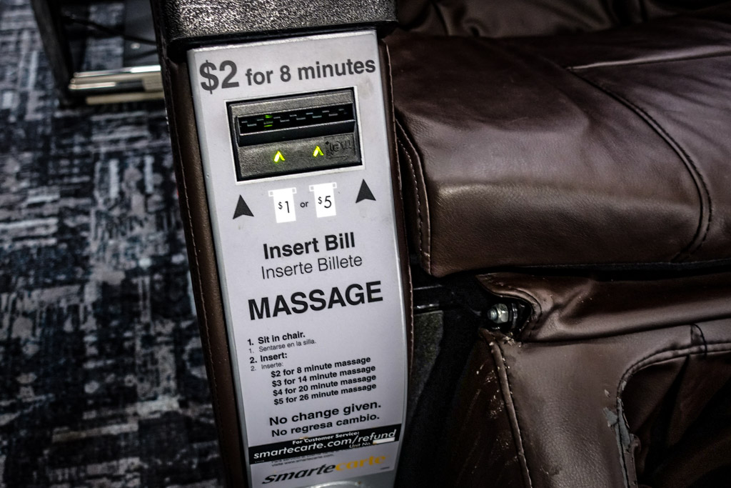 6. Кресла - тоже потёртые, из псевдо-кожи - пожмакают вам спину и ноги за небольшие деньги. Стоит это $2.00 за 8 минут. Заметьте, инструкция говорит, что надо сначала сесть в кресло, а потом, изловчившись, засунуть деньги в купюроприёмник. Удачи вам в этом нелёгком акробатическом фокусе! (Если, конечно у вас есть ненужные $2!)