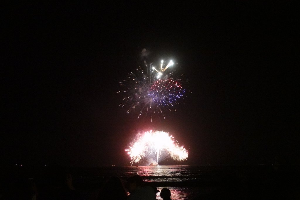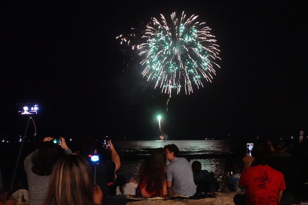 8. Так как мы были на пляже, никакого официального отсчёта не было - однако в какой-то момент в море загремел салют. Он действительно запускался с какого-то судна, которое подогнали и поставили недалеко от берега. Однако, оно было всего одно. Я, если честно, представлял себе небольшую флотилию из таких судов, каждое запускающее в небо яркую канонаду огней. Но и так было красиво.