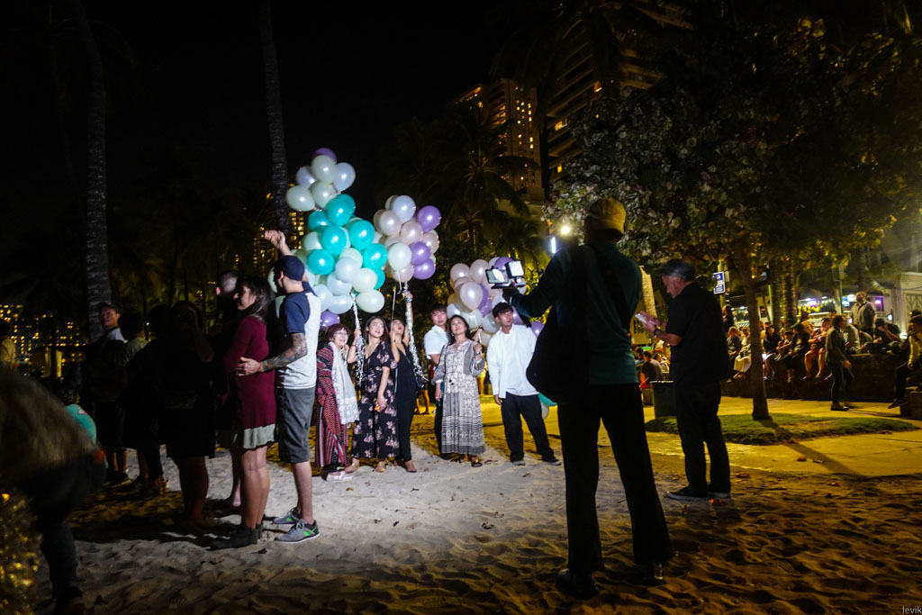 7. Рядом группа японских туристов устроила какую-то очень сложную фотосессию с шариками и подсветкой. Мы очень надеялись, что все эти шарики не отпустят в небо. На Гавайях следят за окружающей средой, никто не хотел, чтоб все эти шары оказались потом в море. Но японцы вроде как пофотографировались, и ушли, вместе с шарами.