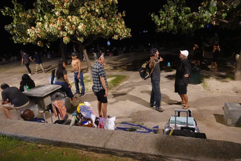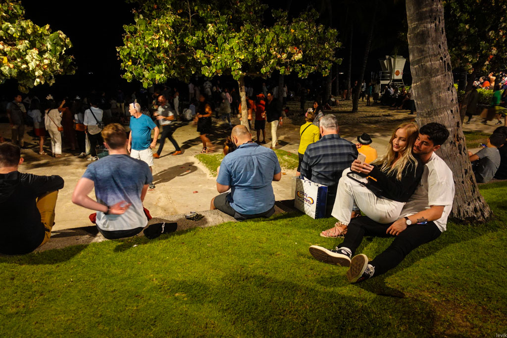 3. Дорогу от пляжа отделяет полоса газона. Уже тут сидят люди, пришедшие посмотреть на салют. Кто-то снимает последние селфи десятилетия.