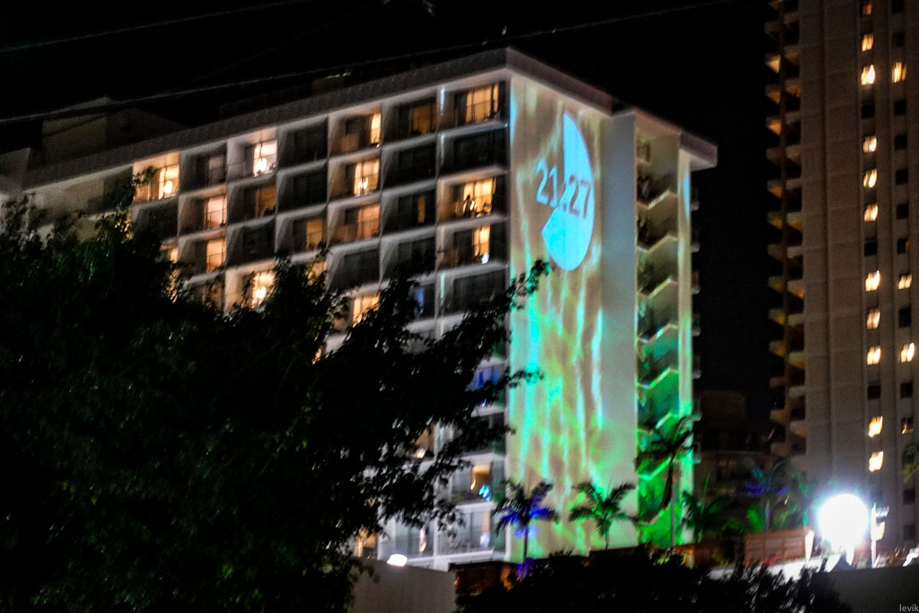 1. Несколько часов мы болтали и вели беседы на очень разные темы, от политики до кулинарии. А где-то за полчаса до полуночи собрались, и вышли в сторону пляжа. Нам объяснили, что на новый год с воды будут запускать мощные салюты со специально подогнанной баржи. Пока шли к пляжу, я заметил, что на один из домов проецируют часы обратного отсчёта.