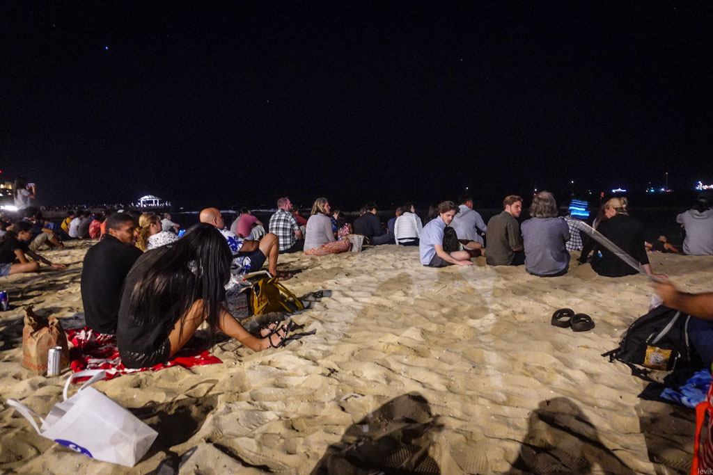 5. А всё пространство ближе к воде занято зрителями, разместившимися на одеялках. По закону на здесь нельзя выпивать на улице, и местные предупредили нас, что полиция будет очень строго следить за любыми попытками вскрыть шампанское на пляже. У каждой группы свой подход к этой проблеме - кто-то заранее перелил его в невинно выглядящий сосуд, кто-то заныкал бутылку в сумке. Есть те, кто пришли с пивом - банки легче прятать по карманам. А некоторые решили, что можно на пляже и не пить, но таких явно меньшинство.