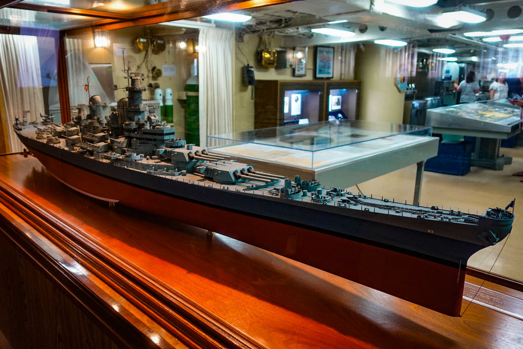Из-за размеров, эту громадину трудно сфотографировать так, чтоб можно было оценить её форму, так что давайта я вам покажу её макет. Длина судна - 270 метров, ширина - 33. Говорят, что когда Миссури проходил через панамский канал, линкор то и дело задевал стены шлюзов, издавая ужасное скрежетание.