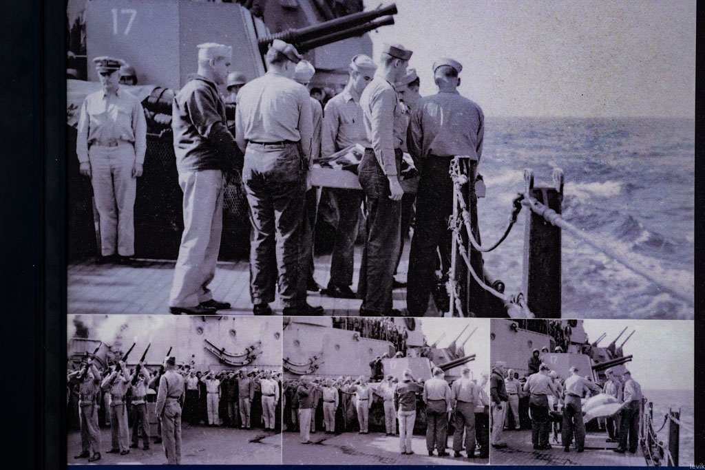 Для похорон тело надлежит обернуть в военный флаг, и разумеется, на борту Миссури не оказалось флага Японской Империи. Поэтому несколько американских матросов всю ночь шили флаг противника, специально для этих похорон. (Напомню вам, что военно-морской флот Японии использовал так-называемый "Флаг Восходящего Солнца", а не просто красный кружок на белом фоне.)