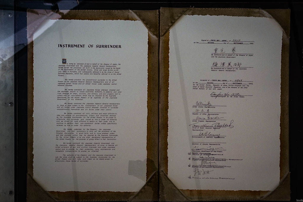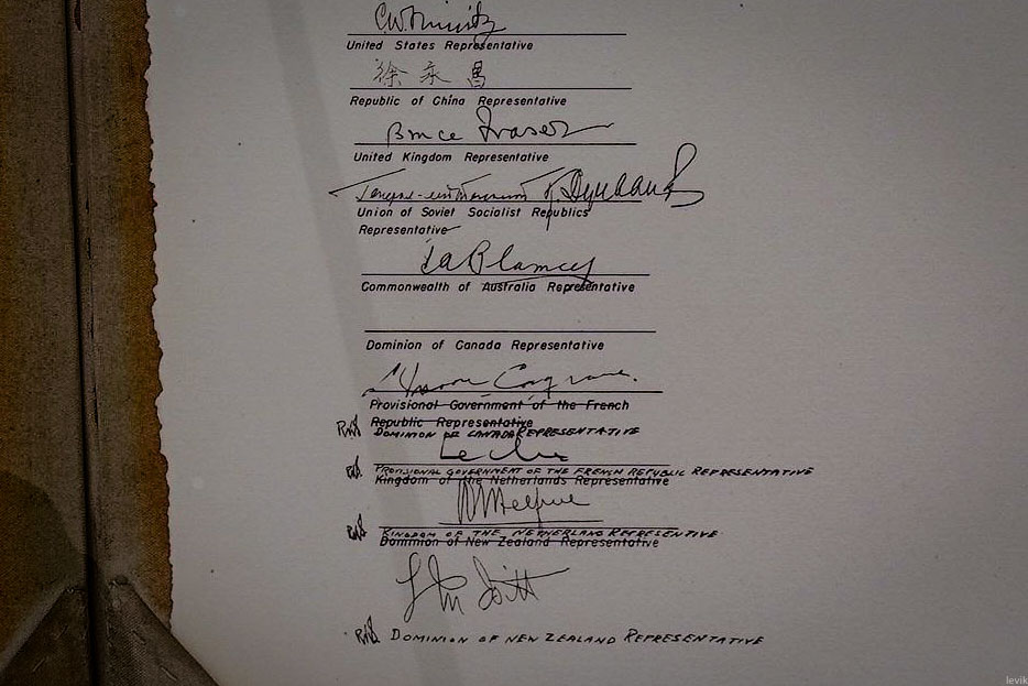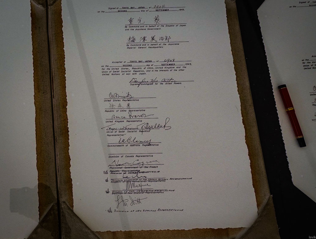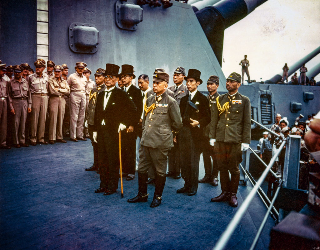 Второго сентября 1945 года, на борту последнего американского линкора состоялась церемония капитуляции Японской Империи. Подписание Акта о Капитуляции официально положило конец многолетней Второй Мировой Войне. На церемонии присутствовали не только американцы и японцы, но и представители многих других стран-союзников. Министры, генералы, адмиралы, и так далее. Согласитесь, это довольно серьёзная штука!