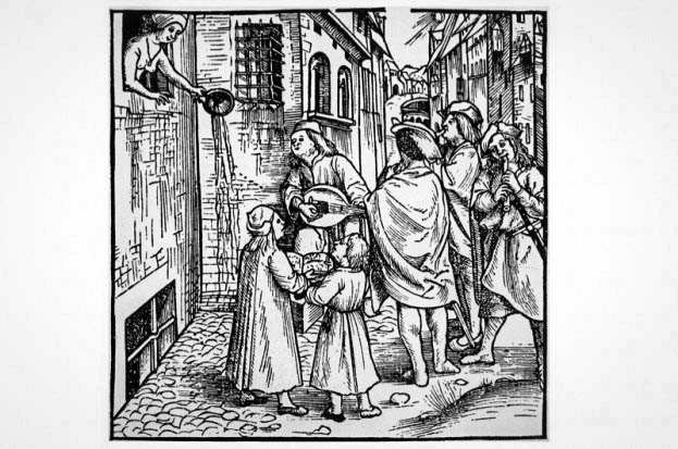 К сожалению, в те времена в городских домах не было никакой канализации, и все горожане использовали ночные горшки, чтобы справлять нужду. Во многих городах того времени были специальные канализационные стоки, которые выводили нечистоты за пределы города, но не всем жителям было охота тащить свои горшки на улицу - особенно тем, кто жил на верхних этажах (лифтов ведь не было!) Поэтому многие просто выливали их из своих окон, иногда попадая на прохожих внизу.