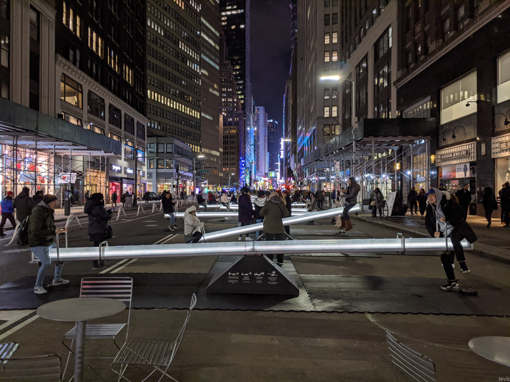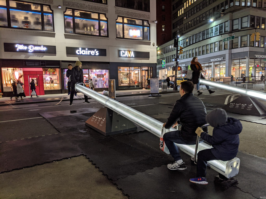 3. А другие участки Бродвея то и дело закрывают временно, тоже предоставляя их для различных интерактивных инсталляций на потеху горожанам. Весь январь на квартале между 37й и 38й стрит стояли вот такие светящиеся качели.