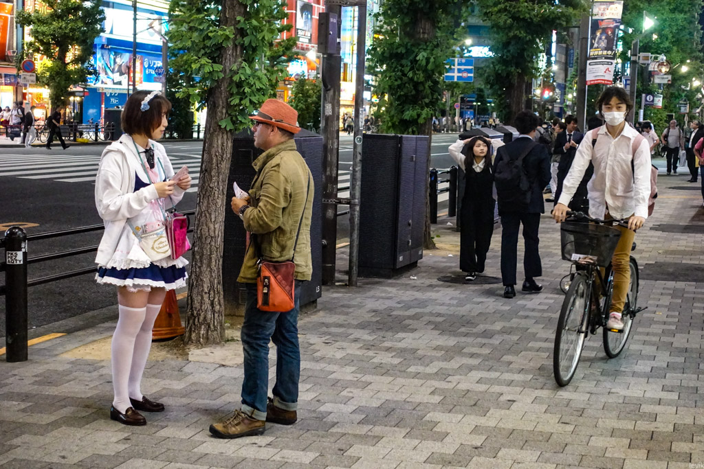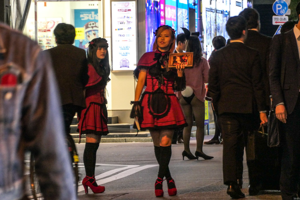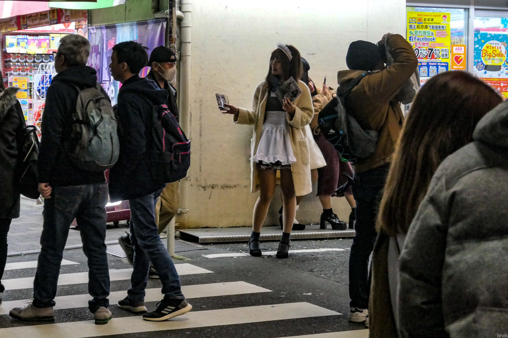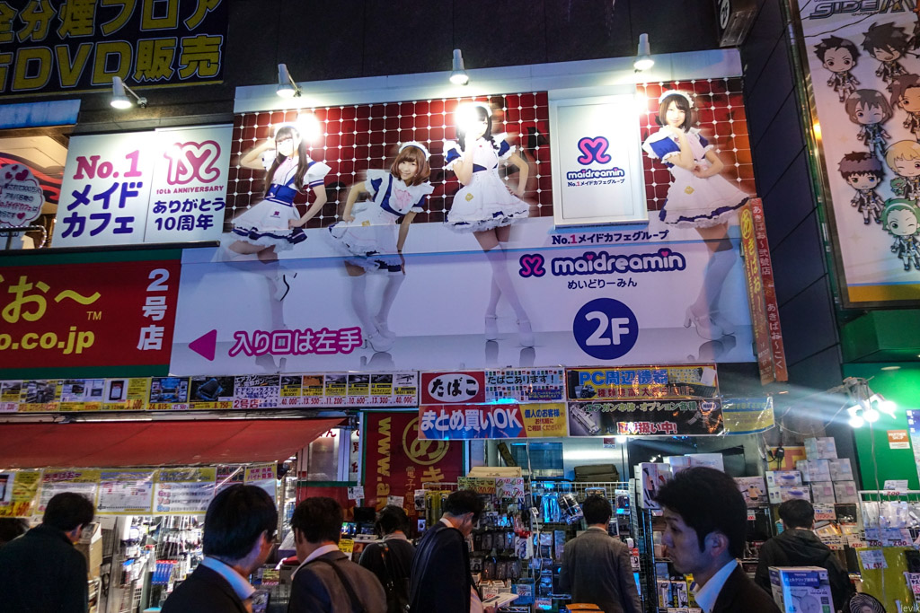31. И тут, с сумерками, на улицах появляются девушки в нарядах горничных. Не настоящих горничных разумеется, а их архетипа из японской поп-культуры. В коротких юбочках, обтягивающих фартучках и на высоких каблуках. Они улыбаются прохожим мужчинам, пытаясь всучить им листовки с рекламой своих заведений.