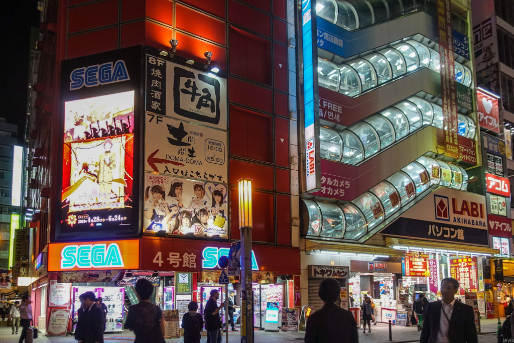 29. Вечером всё это зажигают. Акихабара начинает подсвечиваться, переливаться, подмигивать. Становится ещё более очевидно, что рекламой тут покрыт практически каждый квадратный метр.