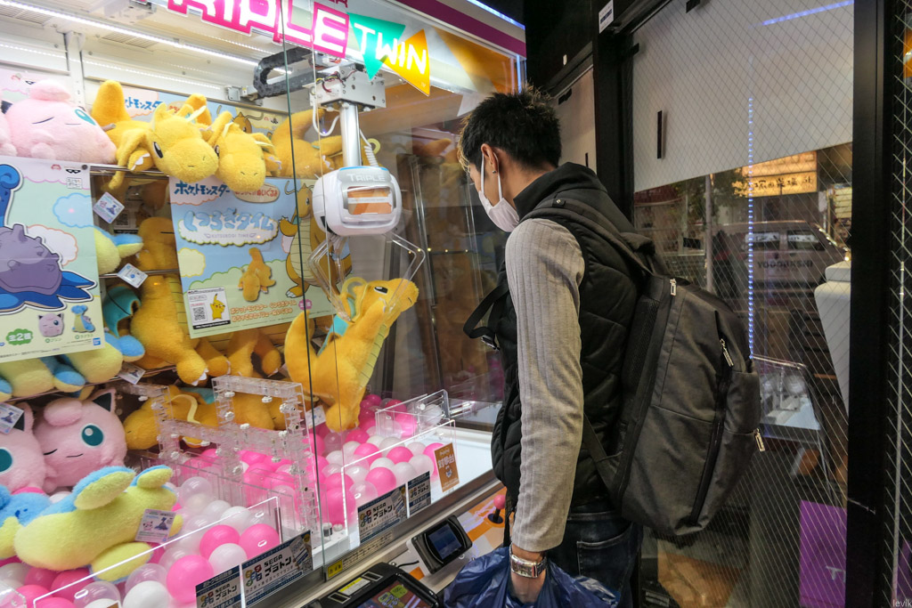 19. Но вообще, самые популярные автоматы в Японии это вот такие хваталки. Они занимают все первые этажи, так как зарабатывают хозяевам наибольшее количество денег. Клещи в этих штуках всегда сделаны настолько слабыми, что даже если ты идеально прицелился, выиграть что-то очень трудно (через секунду после того, как я сделал фото, этот жёлтый плюшевый динозаврик сорвался вниз).