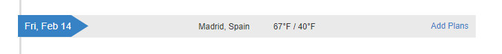 Самое близкое, что я смог найти, это плашки с погодой в веб-версии онлайн сервиса TripIt. Кстати, если вы любите путешествовать, и по какой-то причине до сих пор не используете TripIt, то вот ваш шанс очень сильно упростить свою жизнь. Этот сервис считывает электронные письма с бронированием отелей, авиабилетов, аренды машин, и т.д., а потом держит это всё в мобильном приложении, делая информацию доступной даже в отсутствии связи. (Очень полезно, когда на борту самолёта надо заполнять иммиграционную карту, где просят написать адрес отеля.)