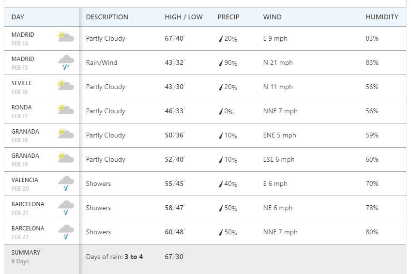То есть можно запросто посмотреть погоду на ближайшие дни в одном конкретном месте. Но если поездка включает в себя несколько городов или стран, и длится больше недели, то для того, чтоб составить точный план нужно будет делать много поисков, и сверять нужные даты.