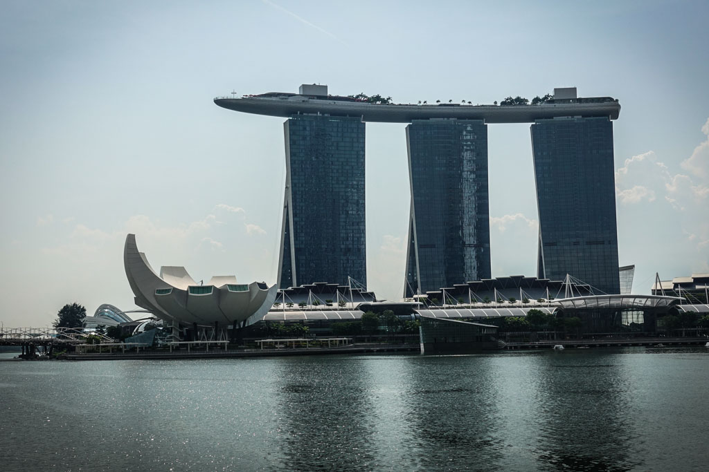 4. Если же говорить о самом узнаваемом строении Сингапура, то вот оно - это трёхствольное здание гостиничного комплекса Marina Bay Sands, с огромной гладильной доской поперёк верхушек этих башен. (На этой доске находится самый известный селфи-бассейн в мире.)