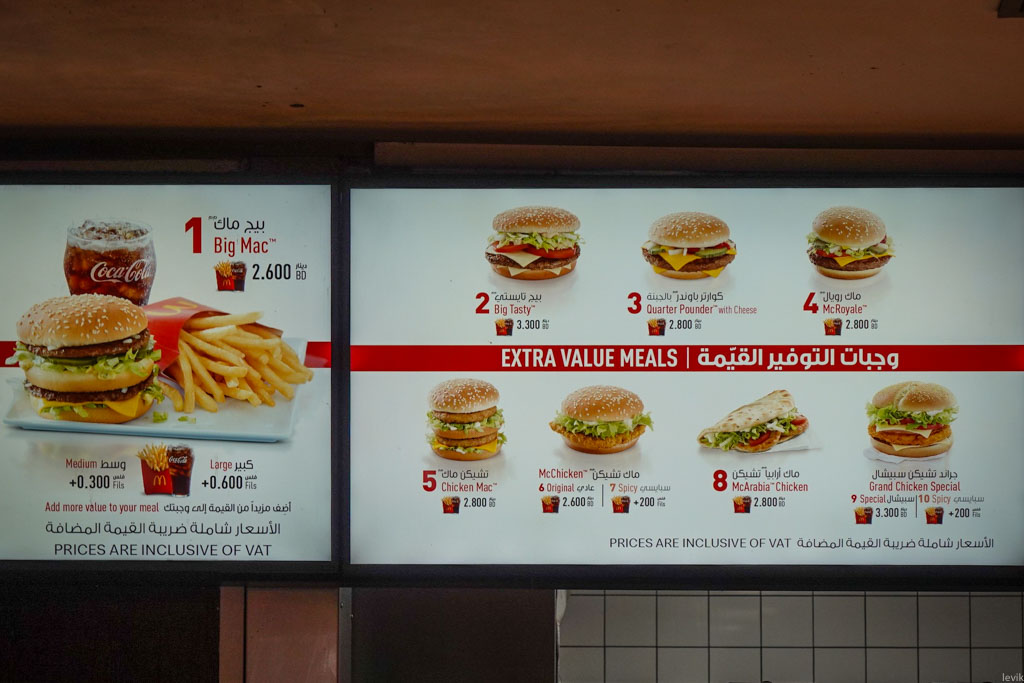 14. Но одно дело дорогое кофе, а другое - уравниловка всего мира, МакДональдс. Экономисты считают цены местных Макдаков настолько показательными, что существует даже так-называемый "Big Mac Index", где покупательную способность местной зарплаты переводят в местные же Биг Маки. Здесь этот всемирно известный двухэтажный гамбургер, вместе с колой и картошкой, обойдётся вам в 2.6000 BD, или чуть меньше семи долларов!