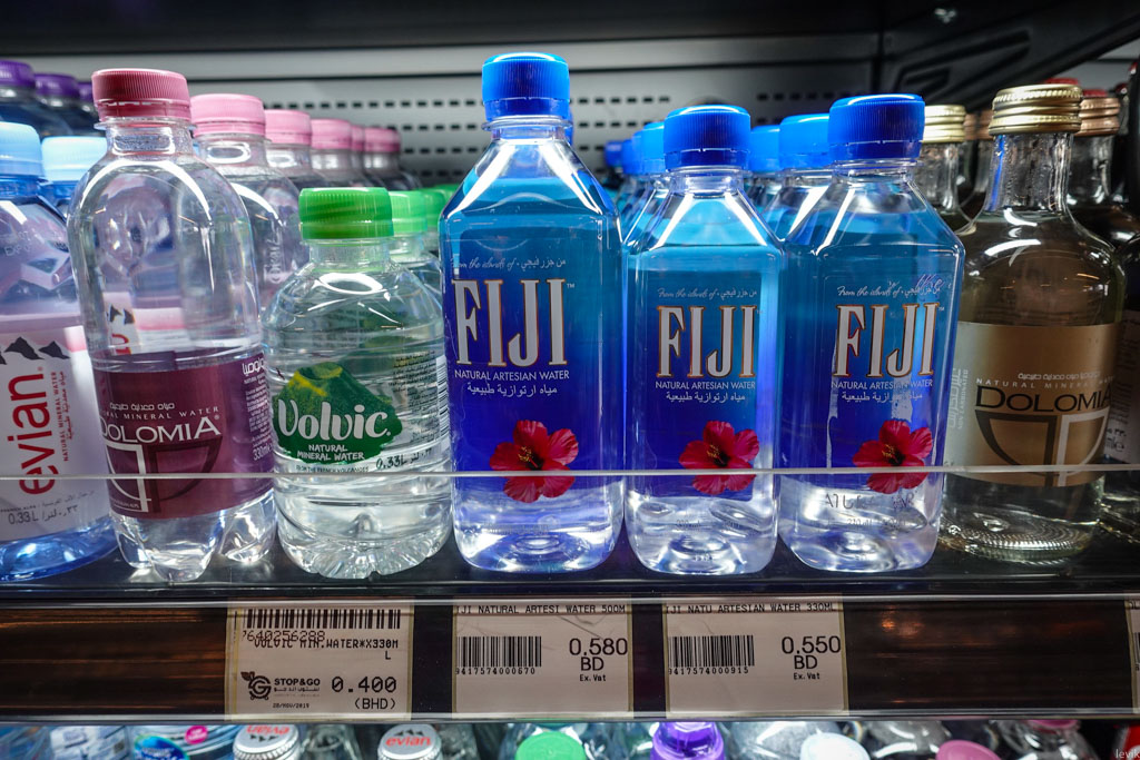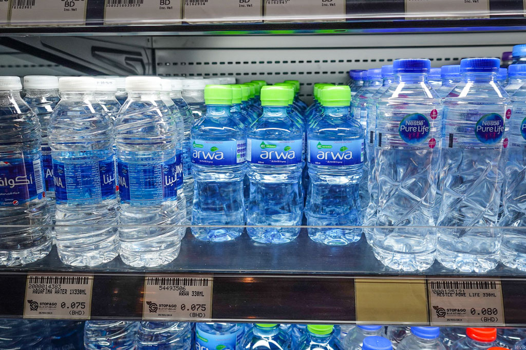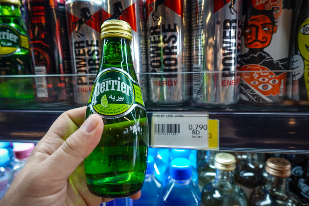 9. Хорошо, вроде мы разобрались со стоимостью денег, и с их физическим видом - давате теперь посмотрим на цены. Сколько чего стоит, если в Бахрейне рассчитываться местными динарами? Начнём с самого простого - питьевой воды в бутылках. Тут очень низкие цены: 75 и 80 филс за поллитра. По американским меркам, это сущий пустяк - около двадцати центов. Но это за местную воду, произведённую в Бахрейне.