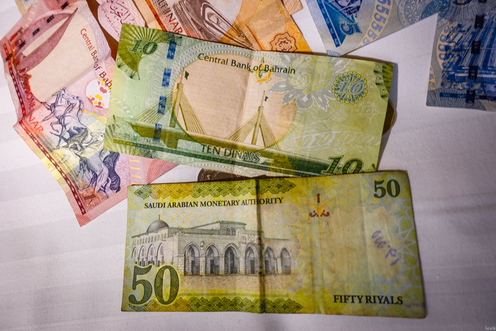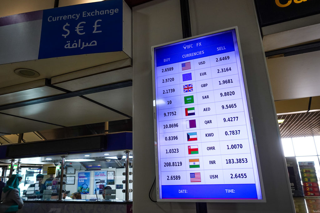1. Дело в том, что один бахрейнский динар равен примерно 2.65 долларам! Я об этом разумеется узнал, вбив в Гугле "1 BHD to USD", но вам для наглядности сфотографировал меню обменника в аэропорту. Оказывается, курс к доллару зафиксирован на этом уровне правительством Бахрейна.