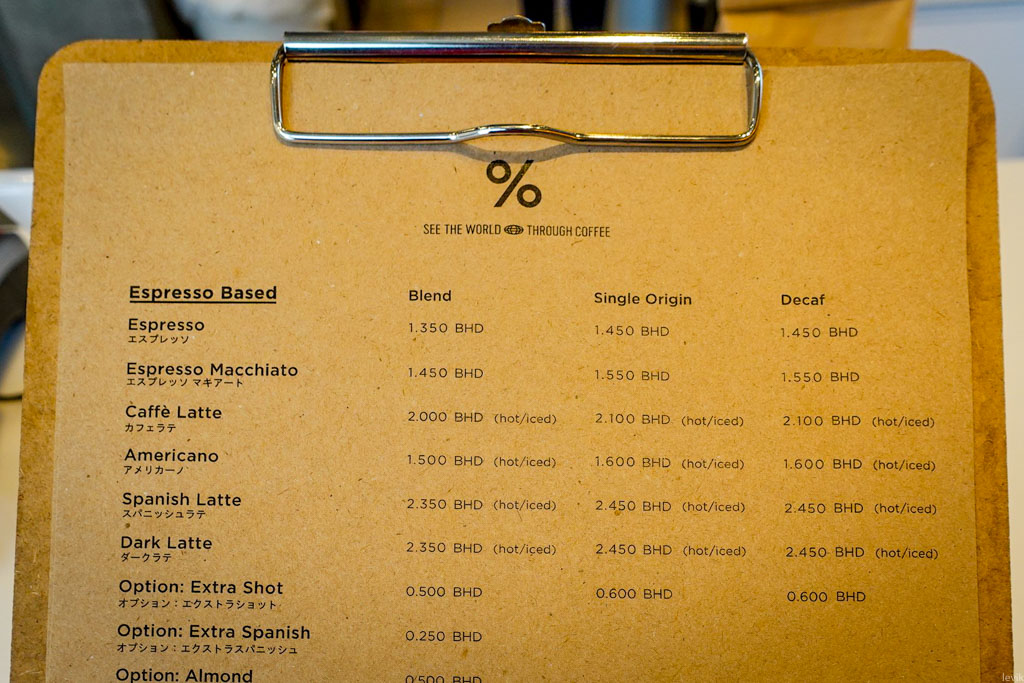 13. А что если вы хотите попить хорошего кофе? Тут я завидую жителям Бахрейна, так как у них (в отличие от НЙ) есть точка моей любимой кофейной сети - % Arabica. Смотрим в меню - обычное латте стоит два динара - это чуть больше пяти долларов. Это чуть дороже японских цен - там 450 иен - по нынешнему курсу это $4.07.