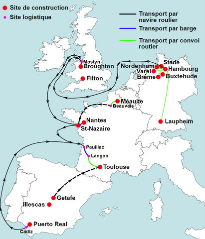 На этой карте показаны разные места в Европе, где производятся части для A380. Куски фюзеляжа производят в Германии; крылья - в Великобритании; брюхо и хвост - в Испании. Всё это свозится на кораблях в французский порт Бордо, откуда на специальных баржах доставляется по реке в город Лангон.
