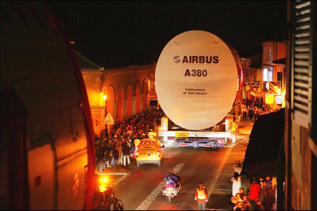 Крупные составляющие для самолётов Аэробуса производятся в разных частях Европы, а потом свозятся на главный завод возле города Тулузы во Франции. Тут проходит окончательная сборка авиалайнеров. Последний отрезок этой дороги детали везут на специальных широкогабаритных грузовиках.