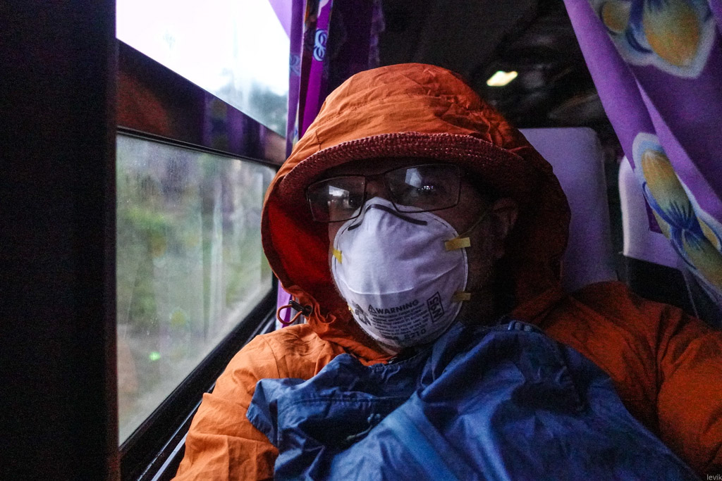 Между нашими двумя сидениями не было даже подлокотника, и мы всю дорогу сквозь сон грели друг-другу плечо. Тут надо сказать, что кондиционер в этом автобусе фигачил безжалостно. В Филиппинах жаркая погода, но в этом автобусе, думаю из-за кондея было градусов десять. Хорошо, что у меня с собой была ветровка, жалко, что не пуховик. Я нацепил на себя всё что можно было: шляпу, капюшон, даже дефицитную маску для лица.