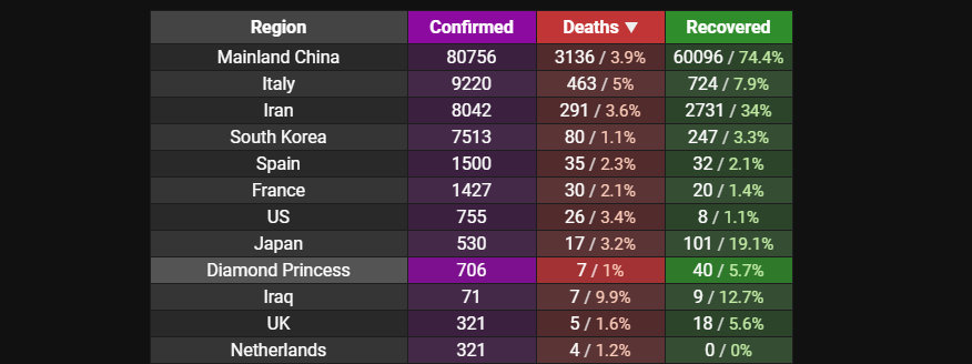 Согласно статистике, в Корее от вируса умирают в 1.1% случаев, в Иране - в 3.6%, а в Ираке его смертельность достигает 10%! Можно было бы свалить такую разницу на качество системы здравоохранения, но это явно не единственная причина десятикратного разброса в статистике.
