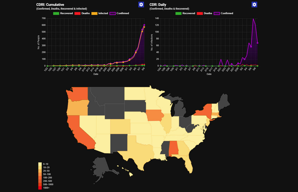 Давайте посмотрим на динамику развития вируса с сайта covid19info.live. Вот ситуация на вчера, на этом графике Нью Йорк впереди всей страны по кейсам: