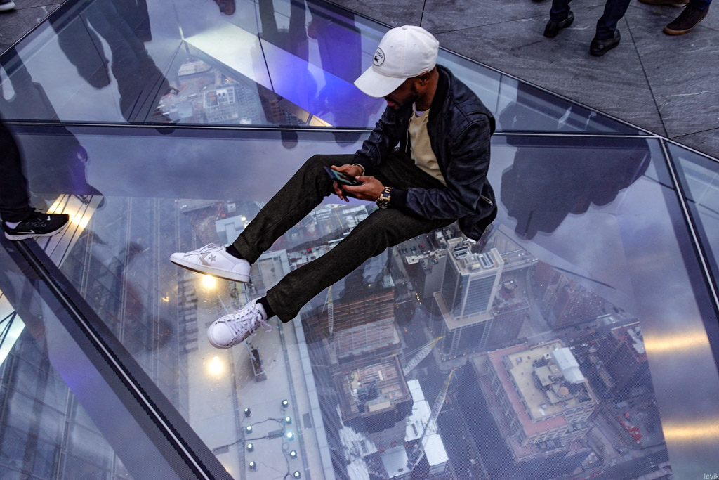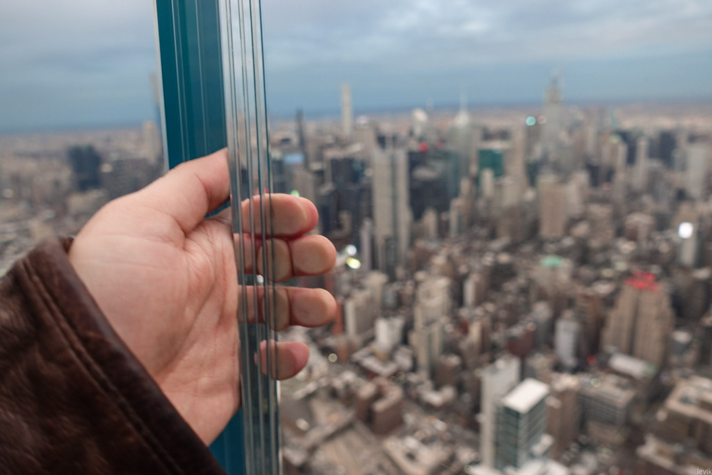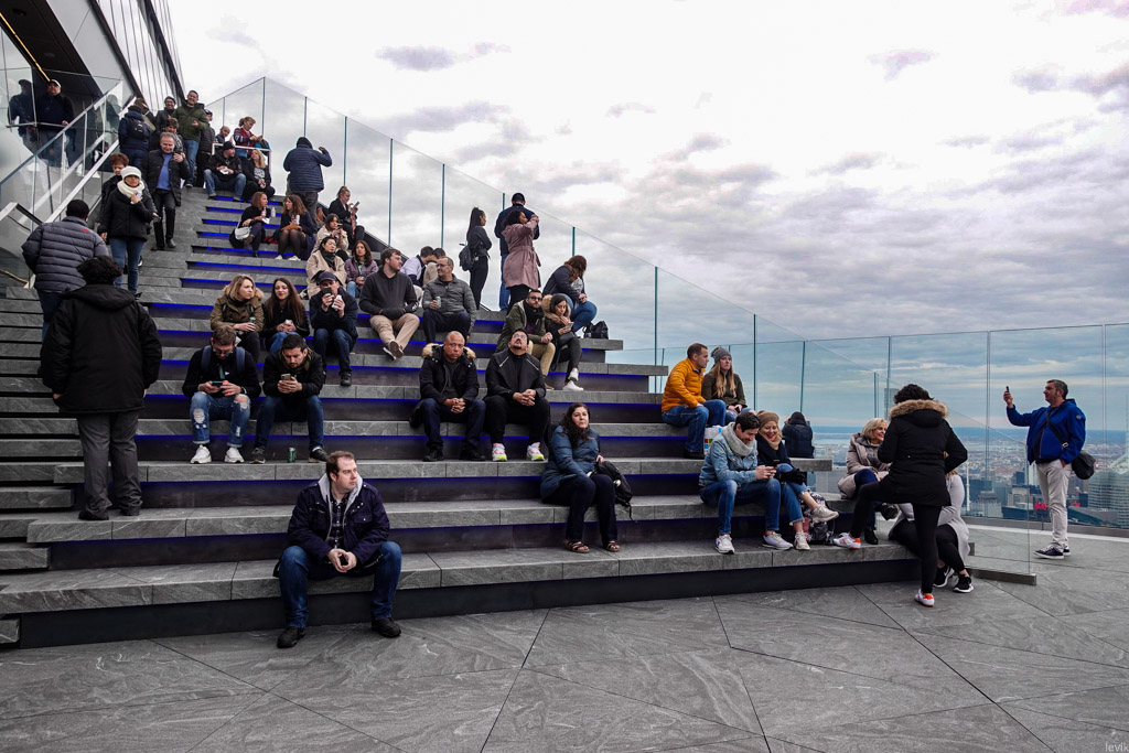 22. Но мы всё же пришли не для того, чтоб глазеть на виды из окна. Главная фишка смотровой Edge в её огромном открытом балконе, который нависает над городом на высоте 344 метра. Кстати, это делает его не только самой высокой площадкой на открытом воздухе в нашем городе, но и во всём западном полушарии! До этого, высочайшей открытой площадкой Нью Йорка обладал Рокфеллер-центр.