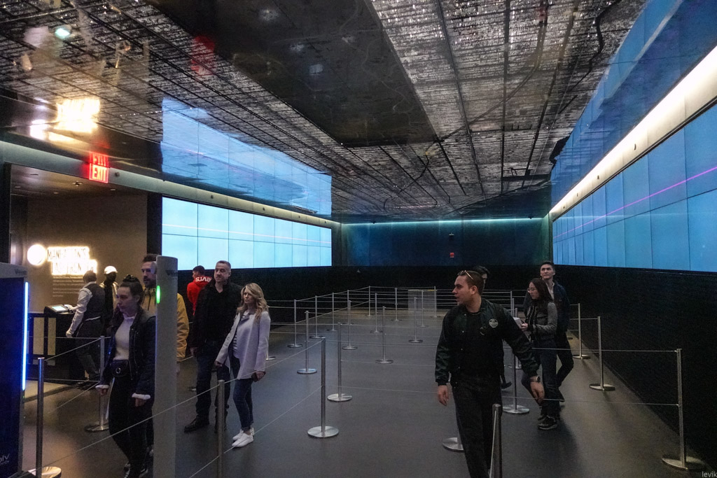 6. Но, не будем отвлекаться. У нас же билет, который заказан ещё в октябре! Билеты продаются на определённое время (в нашем случае - 18:00), но охранники открыли секрет, что они действуют на вход целый час после написанного времени. Если успел зайти, то никто тебя уже со смотровой не выгонит, оставайся сколько влезет. После проверки билетов надо пройти досмотр. Это происходит в прямоутольной комнате, где рассказывают об интересных моментах в истории Нью Йорка. При этом на потолке изображена карта Манхэттена, на которой ярко загорается то место, о котором сейчас рассказывают.