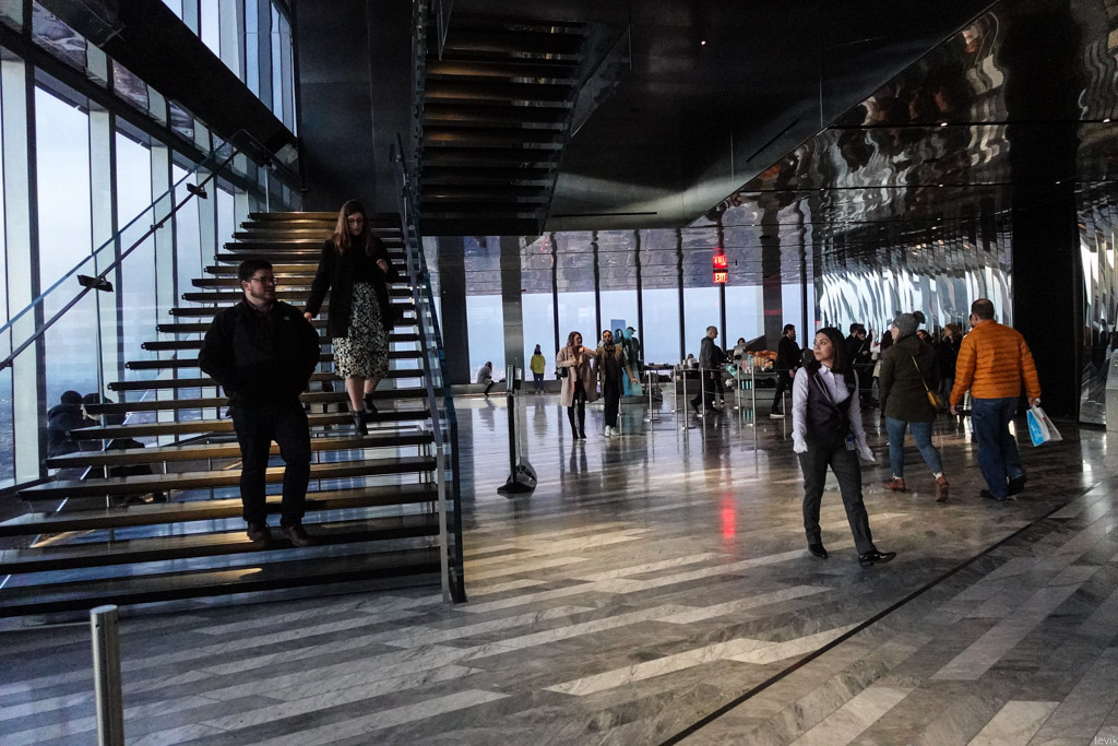 26. Единственная конструкция на открытой смотровой - это вот такая лестница - она ведёт ко входу на 101м этаже, но заодно служит местом посидеть. Самый прикол сидеть ближе кверху, потому что тогда ты возвышаешься над стеклом, которое огораживает площадку по периметру. Сидишь себе, смотришь на город внизу, и есть ощущение, что паришь над ним на каком-то летучем корабле.