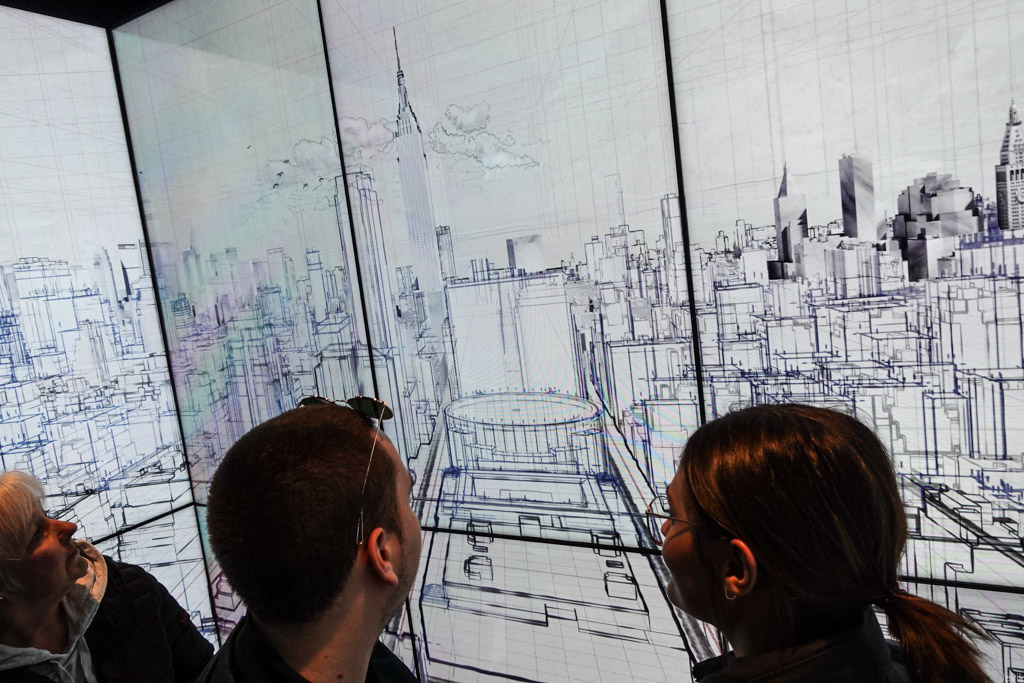 9. То, что лифт по пути к смотровой в наше время не может быть просто обычным скучным лифтом, это правило, кажется, где-то закондадательно прописано. По крайней мере все новые площадки стараются как-то выпендриться. В данном случае - стены лифта это дисплеи, на которых изображены здания города. Сперва - в виде эскиза, потом - как чертёж...