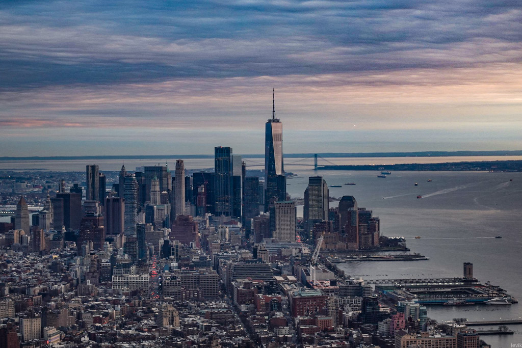 39. На самом юге острова из кучки небоскрёбов гордо высится башня 1-WTC. Там пять лет назад открылась своя, гораздо менее впечатляющая смотровая. А ещё дальше за ней виднеется изящный мост Верразано.
