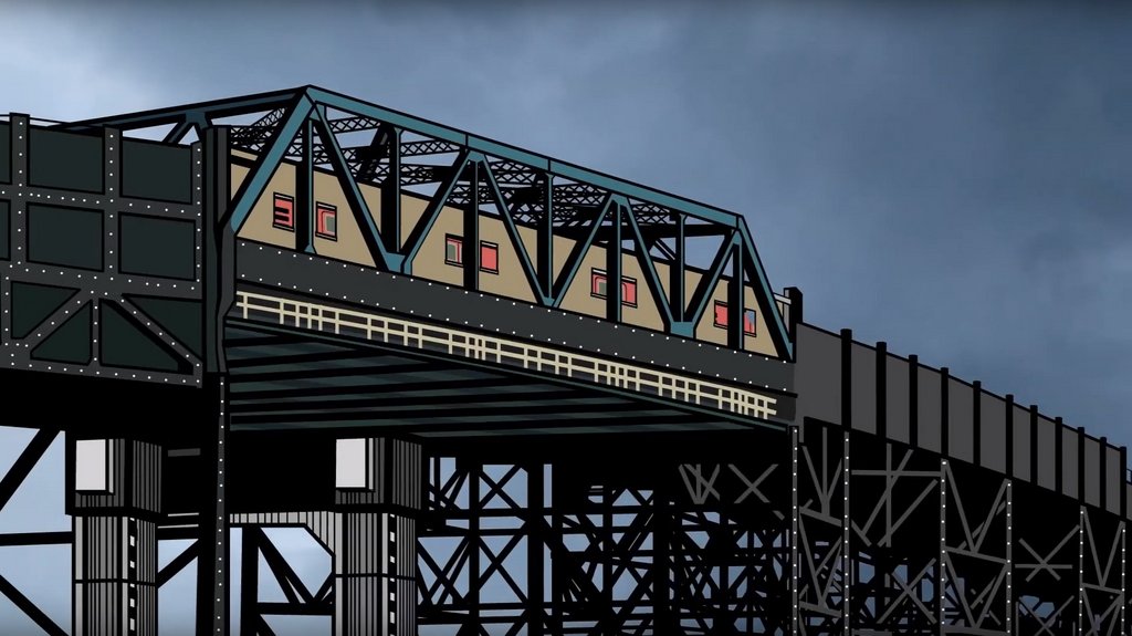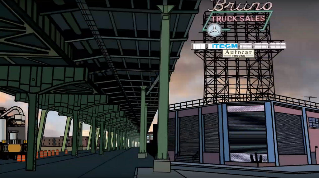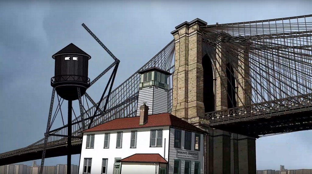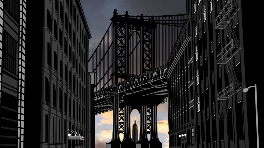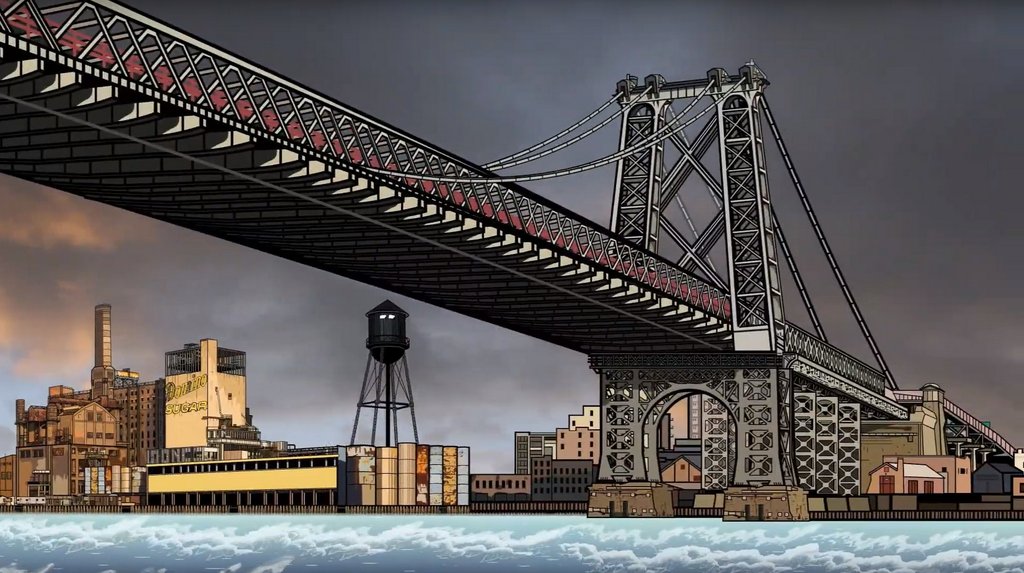 Район этот относительно небольшой, изначально был промышленным, но с закрытием переправы через Ист-Ривер при окончании постройки Бруклинского моста прошёл через стадию деиндустриализации. Признан историческим в 2007-ом году. Между дем, камера находится как раз на пересечении улиц Washington и Front. Прямо перед вами – восточная опора Манхэттэнского моста. Эмпайр Стейт маячит под пролётом как мушка прицела. (Прим. ред.: В жизни этот кадр невозможный, но в мультфильме Лёша его нарисовал так, как видит человеческий глаз!)