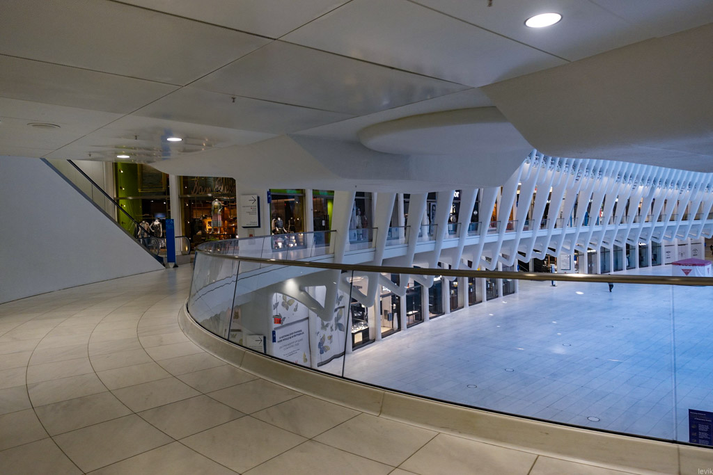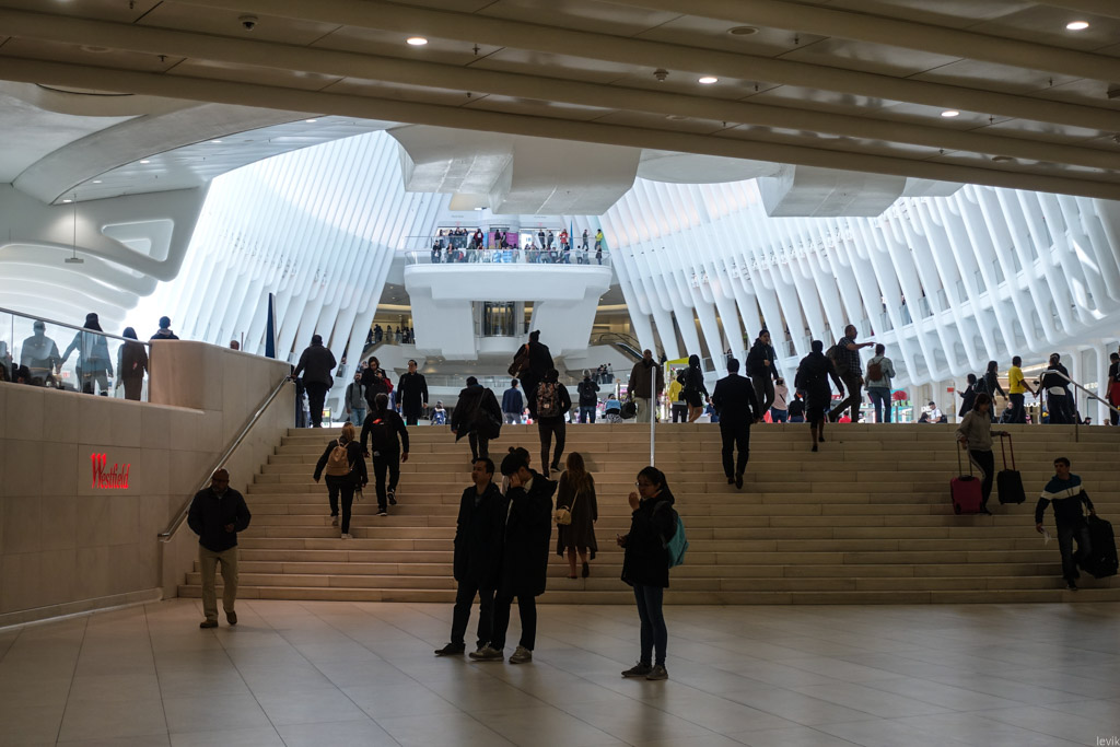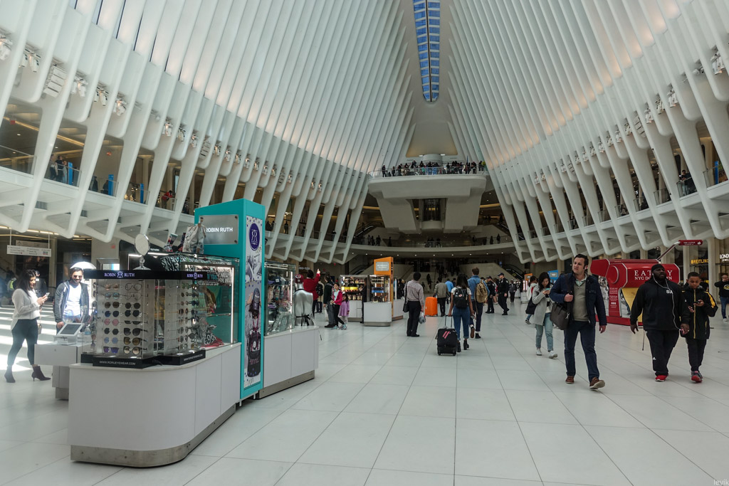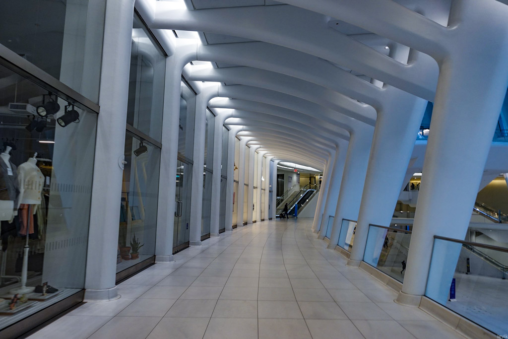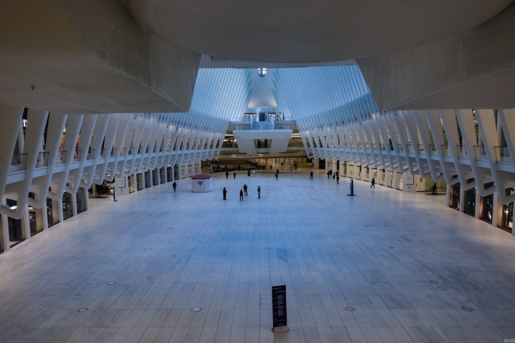 9. Вообще конечно безлюдность длилась недолго. Всё же Окулус соединяет несколько линий метро, и каждые пару мнут на одной из них приходит поезд. Из него выходит горстка людей, и они разбредаются куда-то по своим делам (возможно, просто пересаживаются на другую линию).