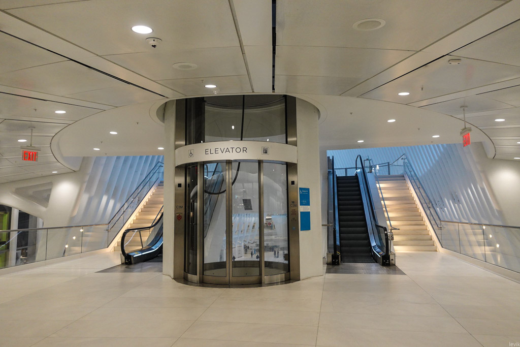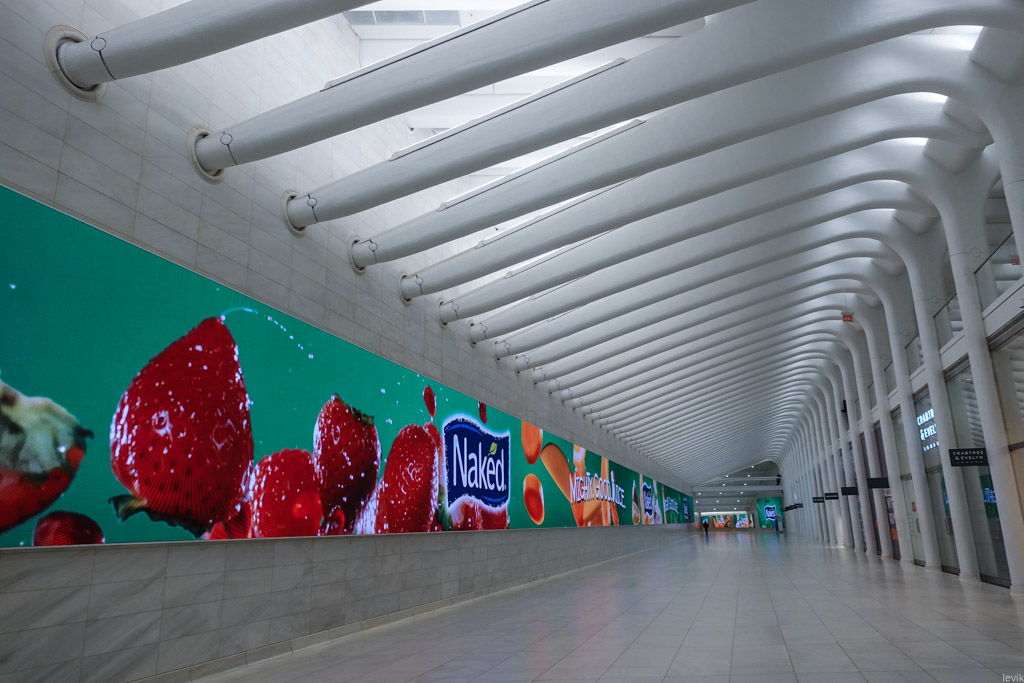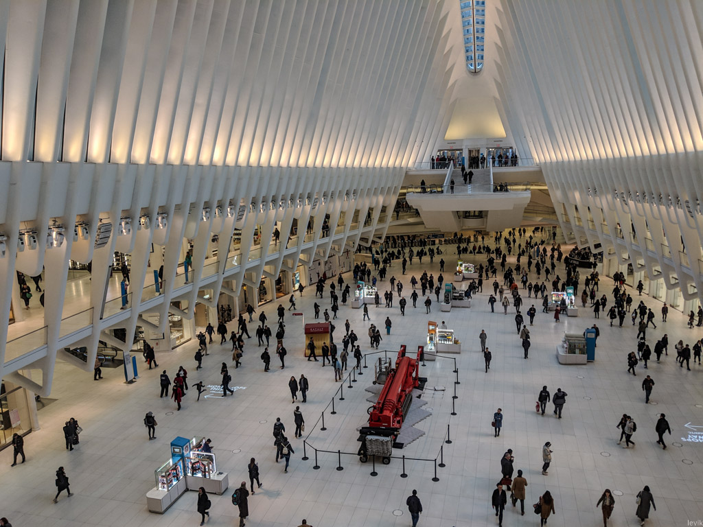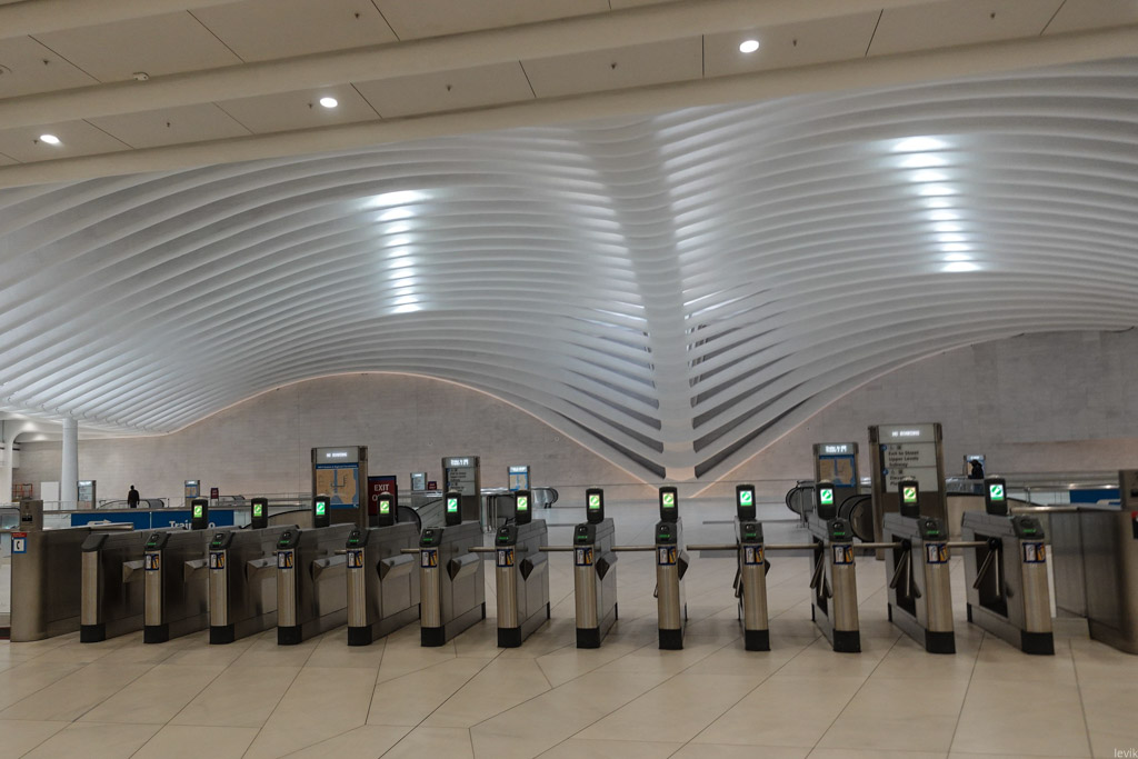 9. Вообще конечно безлюдность длилась недолго. Всё же Окулус соединяет несколько линий метро, и каждые пару мнут на одной из них приходит поезд. Из него выходит горстка людей, и они разбредаются куда-то по своим делам (возможно, просто пересаживаются на другую линию).