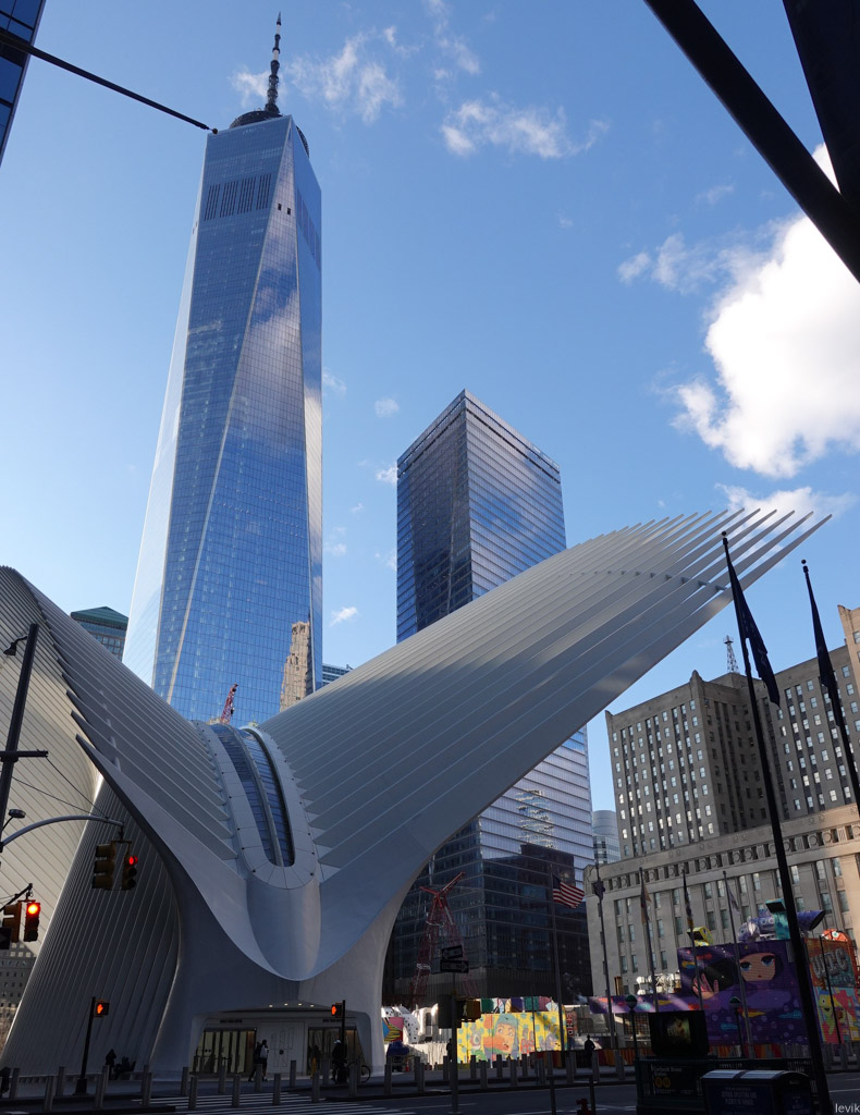 2. Окулус стоит в самом центре даунтауна, и те толпы, которые ежедневно спешат сквозь него - это офисный планктон в пути на работу или с неё. Разумеется, сейчас тут довольно мёртво. Прямо за колючками этой необычной структуры, гордо стремится в небо башня 1 World Trade Center - до сих пор высочайший небоскрёб Западного Полушария.