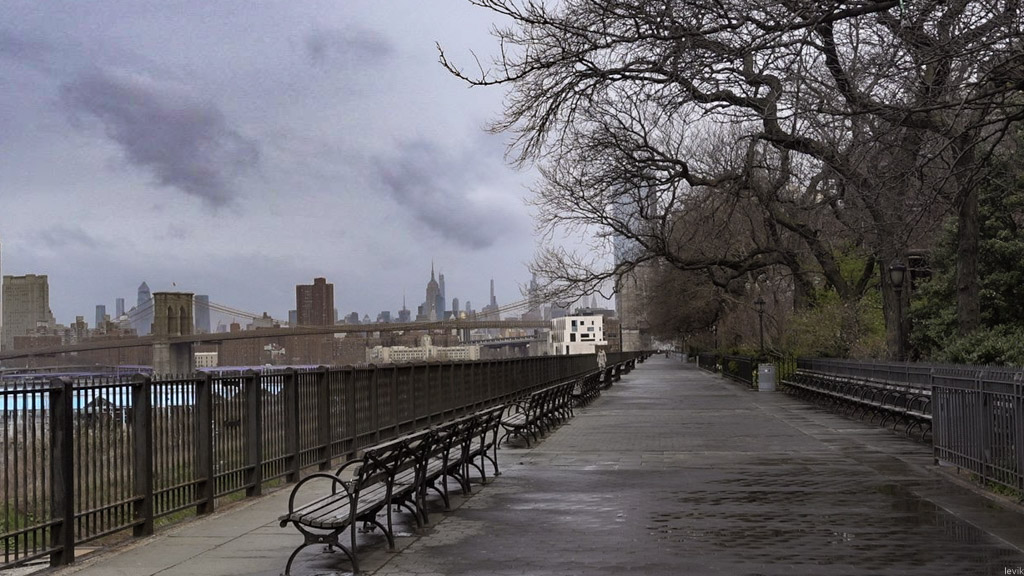 2. Променад Бруклин Хайтс - отсюда открываются отменные виды нижнего Манхэттена, и обычно тут немало местных жителей и туристов. Думаю, в хорошую погоду тут было бы немало прогуливающихся горожан в масках, но я пришёл в несколько дождливый день, и променад был пуст. Никогда раньше его таким не видел.