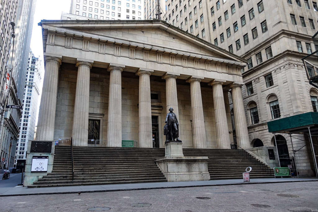 11. Здание Федерал-холл. Здесь в 1789 прошла первая инаугурация президента Вашингтона. Теперь его памятник украшает ступени этого здания. Сами понимаете, тут всегда много желающих сфотографироваться с Джорджем. Но не сейчас.