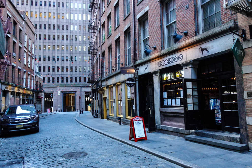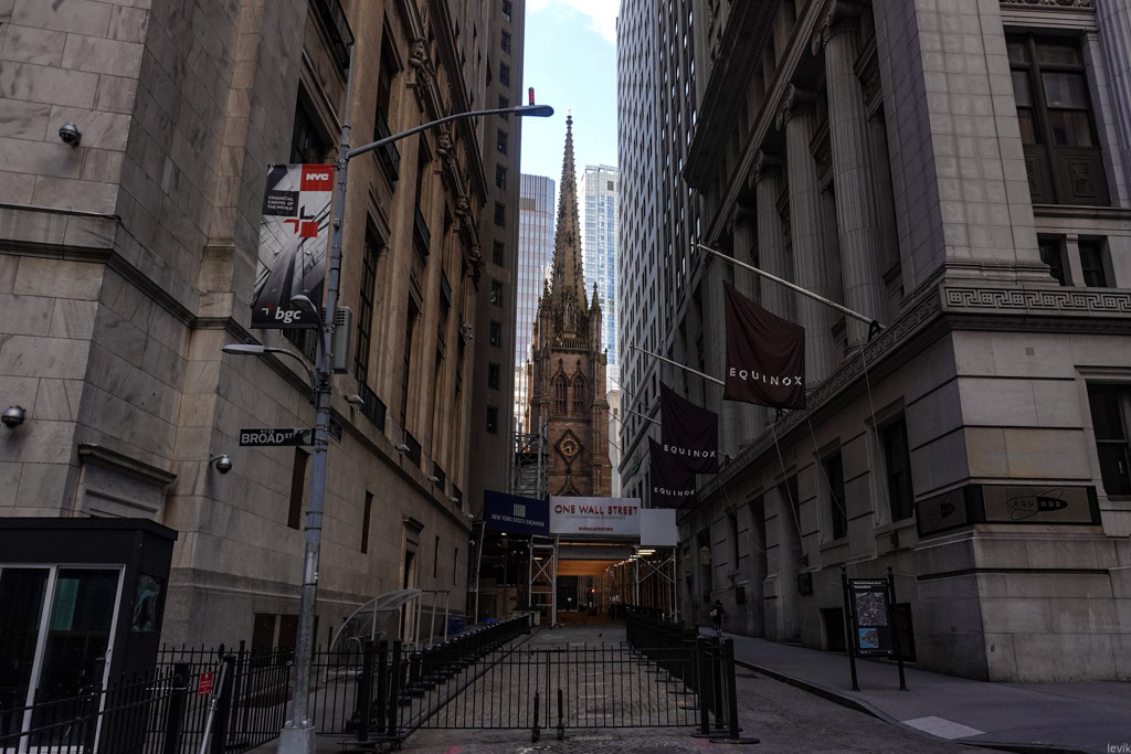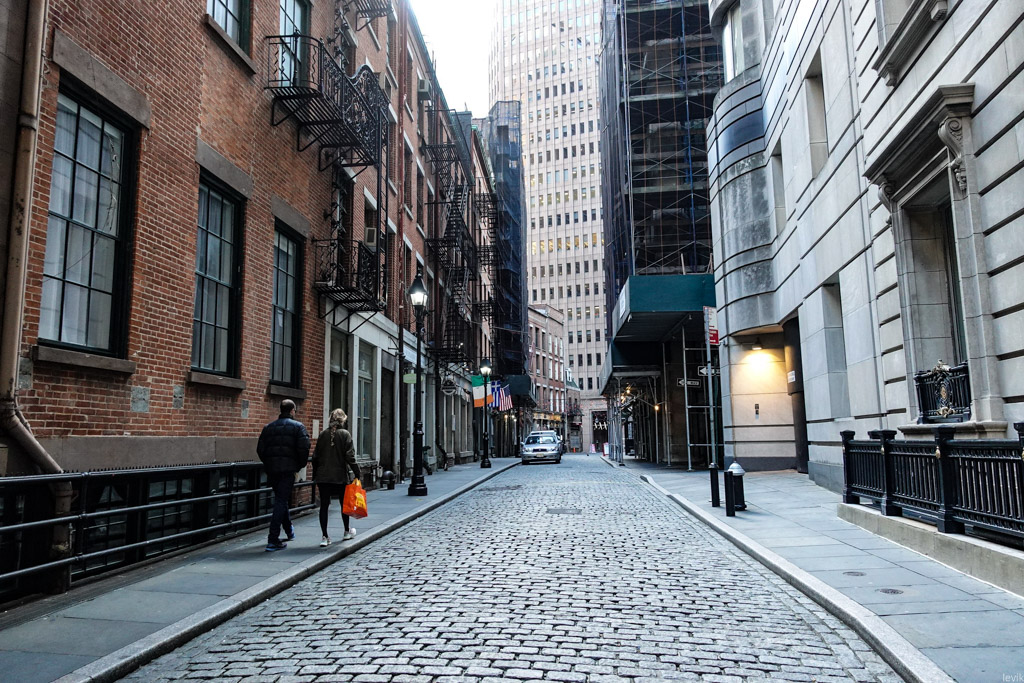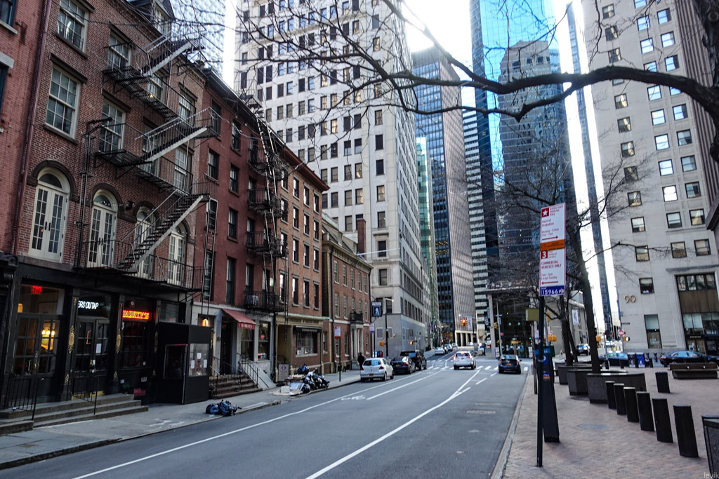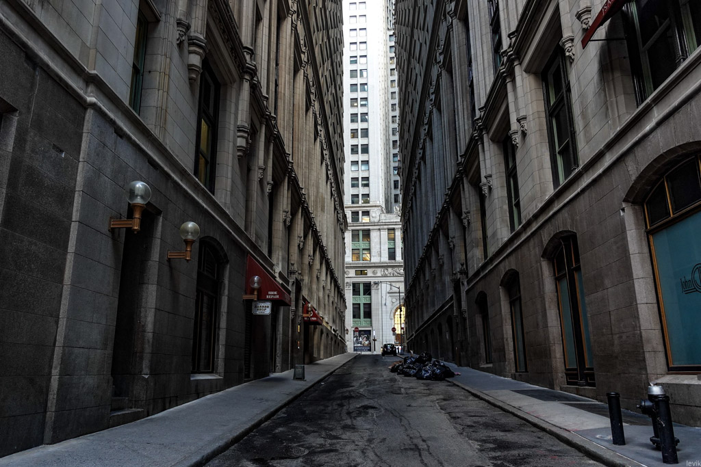 8. Эту узкую улочку можно было бы назвать переулком, если бы не тот факт, что переулков в Нью Йорке практически нет. В будние дни сквозь неё спешат на работу работники финансовых компаний, но сейчас тут пусто.
