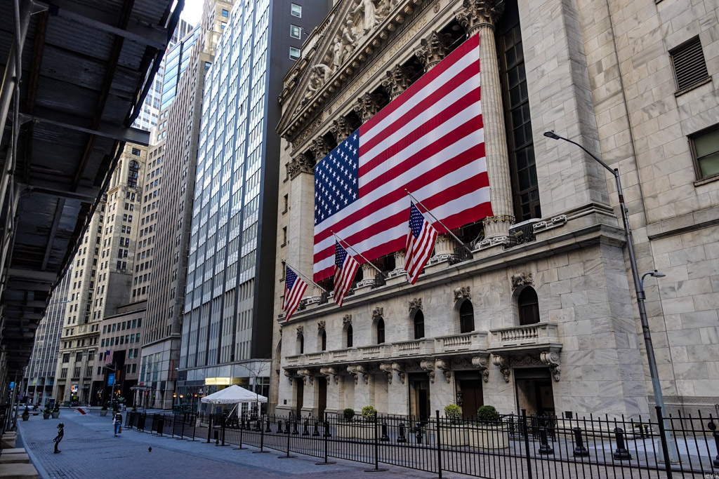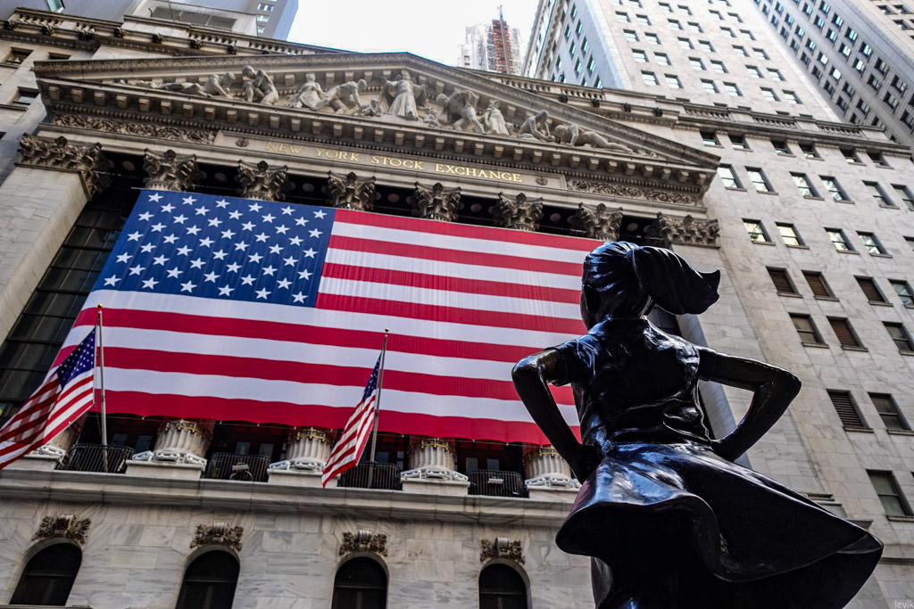 12. Прямо рядом - здание нью-йоркской биржи с огромным американским флагом. Кто это стоит через дорогу, и смотрит на него?..