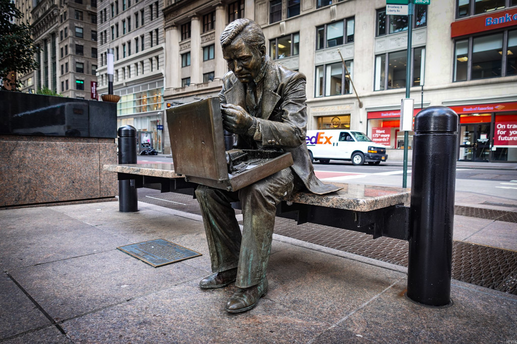 7. Вот я и в Манхэттене. Нижняя часть острова - финансовый центр США, обычно здесь делают большие деньги. Но сейчас всё это пустует. Одиноко, на скамейке сидит бронзовый бизнесмен с портфелем. Это скульптура Doublecheck (Перепроверка) - у неё очень любопытная история связанная с терактом 9/11.