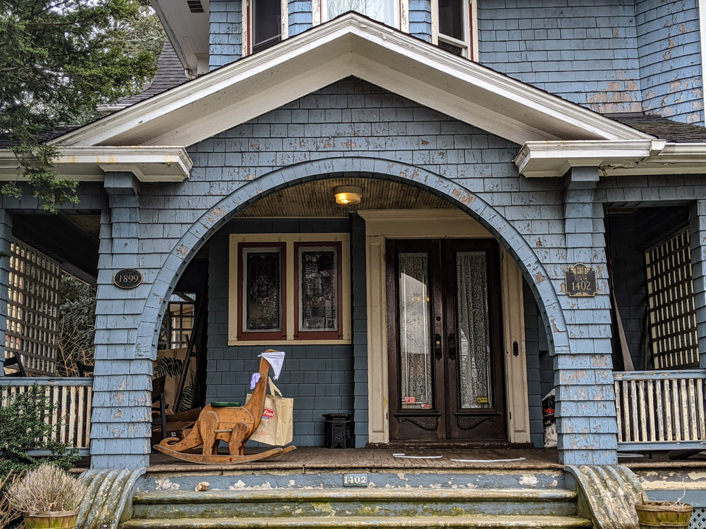 PS: Минутка милоты вдогонку. На крыльце одного из частных теремков нашего района уже много лет стоит детская деревянная качалка в форме динозаврика. Мы, когда мимо проходим, всегда этому ящеру привет шлём. Так вот, когда вышел указ, что всем теперь рекомендуется носить матерчатые маски, хозяева того дома подсуетились, и организовали своему питомцу повязку на лицо!