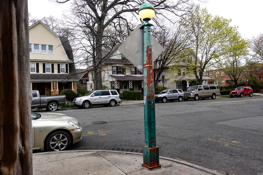 7. О его принадлежности к системе нью-йоркской подземки говорит вот этот столб. Он изрядно облез, но видно, что когда-то был покрашен в фирменный бирюзовый (или какой это?) цвет нашего метро. На его вершине красуется круглый фонарь с зелёным верхом - это значит, что станция работает круглосуточно.