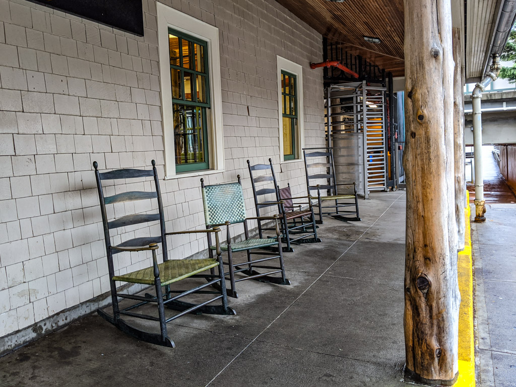 8. Крыша станции поддерживается колоннами из толстых брёвен, а на получившемся под навесом "крыльце" стоят металлические кресла-качалки. Это арт-инсталляция, созданная в 2012 году.