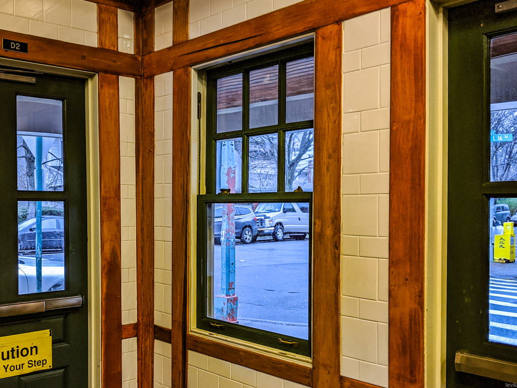 13. Коттеджное прошлое этой станции хорошо заметно по отделке стен. Тут между кафельной плитки сохранились деревянные балки.