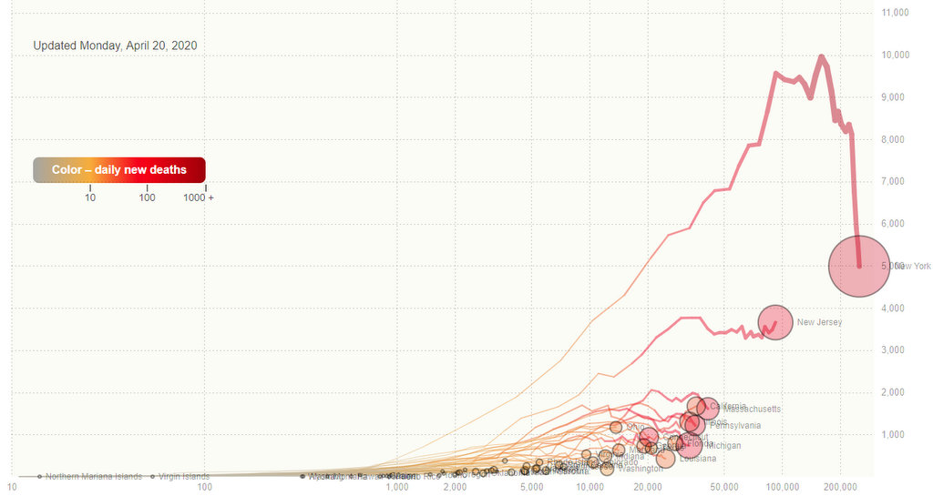 Вот график ежедневно обнаруживаемых новых случаев инфекции по всем штатам США. Как видите, Нью Йорк испытал на себе самый сильный удар этой эпидемии, и я надеюсь, что ни одному другому штату не удастся нас в этом догнать.