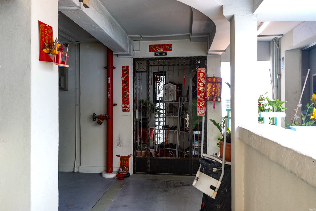 13. Двери все с вот такими решётками. Причём это типовой вариант, а не что-то, что каждый жилец сам добавил после покупки квартиры. Может это лишняя мера безопасности в здании, куда может проникнуть каждый, а может - для того, чтоб можно было дверь открыть, а решётку оставить закрытой, эдакий "пролетарский кондиционер" для жаркого сингапурского климата.