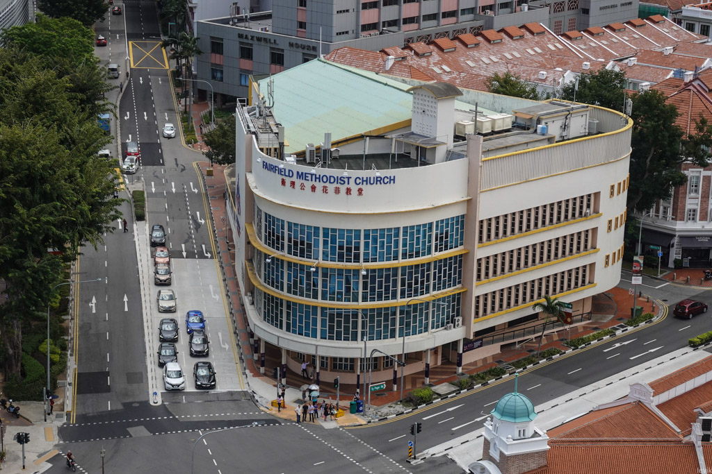 29. Вообще, оглядываясь на центр города с 20го этажа этой панельки, хорошо видно, что Сингапур - город разношёрстного населения. Вон вам буддийский храм, а вот, неподалёку, методистская церковь....