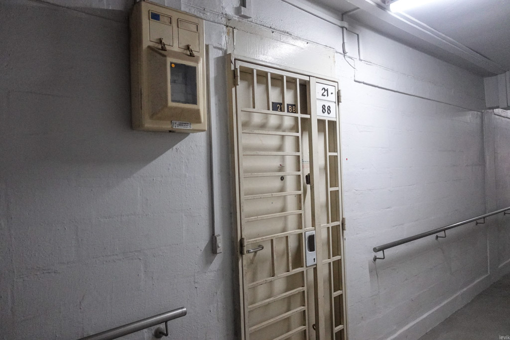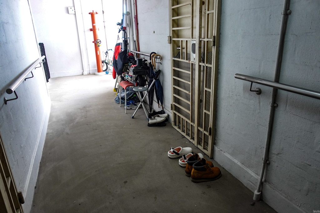 15. Вдоль всей длины коридора тянутся металлические перила. В таких домах ведь много пожилых жильцов, которым нелегко ходить. Но большинство использует эту штуку как кладовку. Возле некоторых дверей чистота и порядок. Кто-то приковал к поручню свой велосипед.