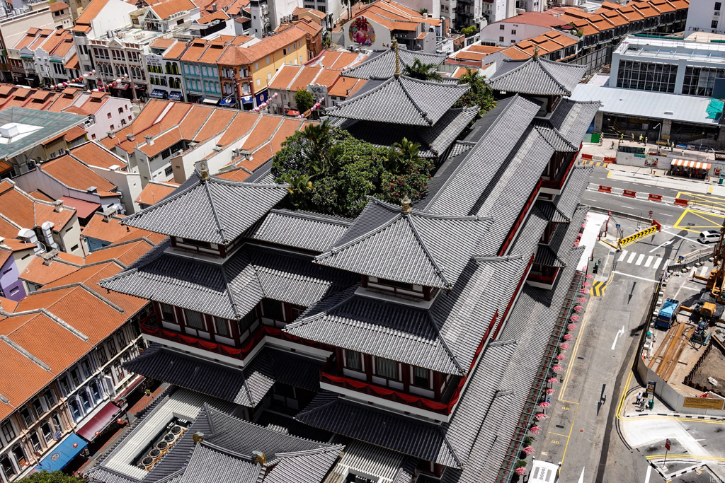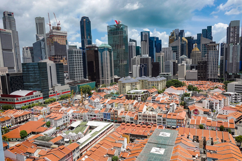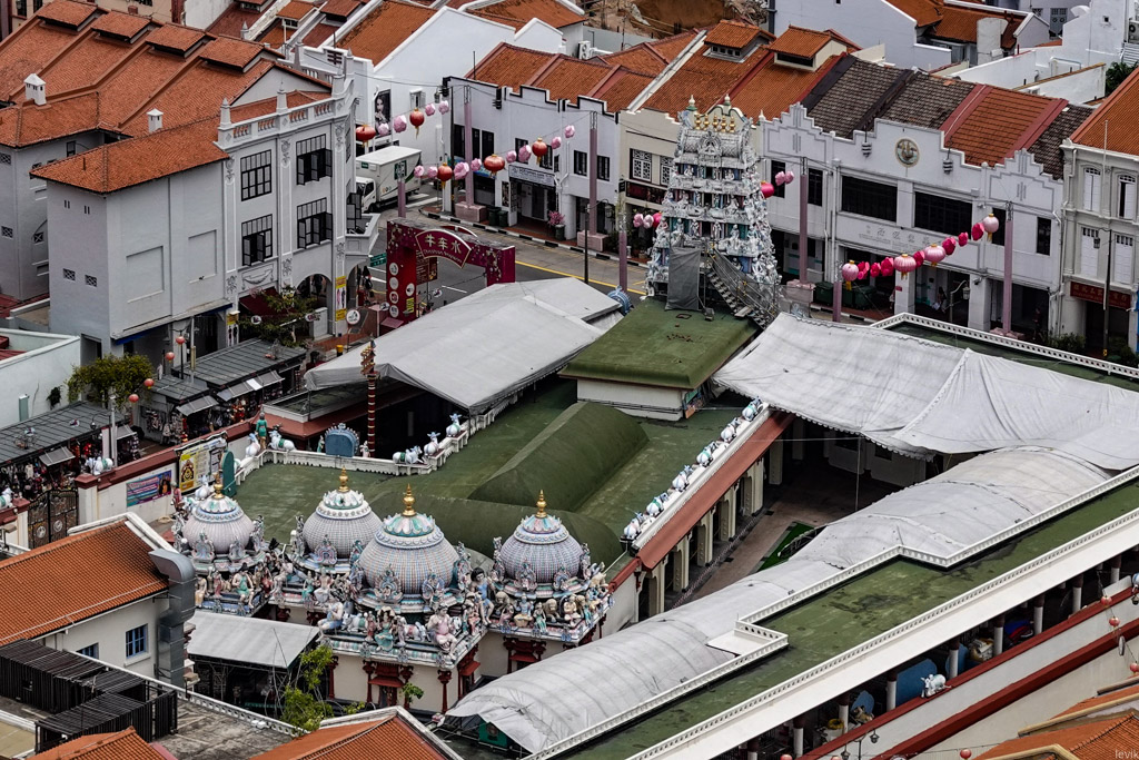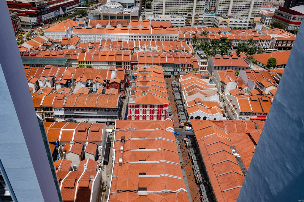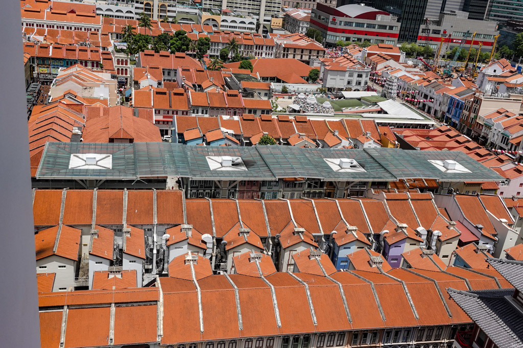 24. Прямо под окнами черепичные крыши старых кварталов чайнатауна - двух- и трёхэтажные сингапурские "шопхаусы", построенные в начале ХХ века. Тут видно, что одна из улиц между ними специально закрыта навесом, чтоб магазинчики на ней можно было посетить во время дождя.